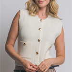 The Woodsen Sweater Vest in Ivory offers a timeless sleeveless knit design, enhanced by elegant gold accent buttons that add a subtle touch of sophistication. This versatile vest provides a comfortable layering option to elevate your outfit while keeping you cozy. Ideal for transitioning seasons, it pairs effortlessly with both casual and dressier looks.