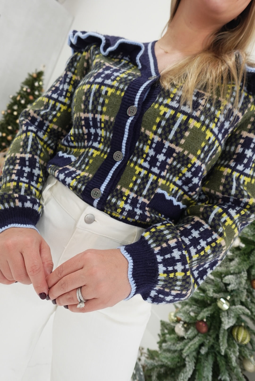 Elevate your everyday wardrobe with this charming York Sweater Top in navy multi. The ruffled yoke detail adds a touch of feminine flair, while the classic plaid pattern brings timeless appeal to any outfit. Perfect for layering over your favorite tee or wearing solo, this cardigan sweater combines comfort with style. The soft fabric feels wonderful against your skin, making it an ideal choice for transitional seasons. Whether you're dressing up for work or keeping it casual on the weekend, this versatile piece has you covered.