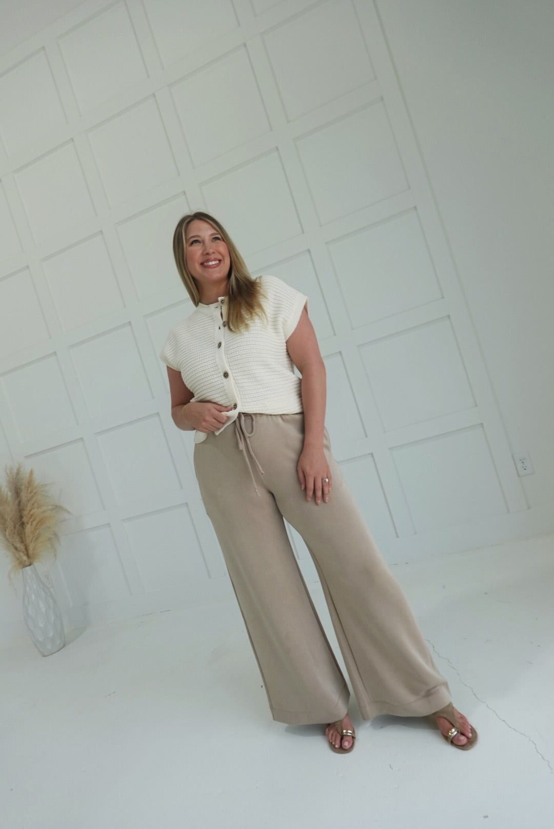 These Zina Wide Leg Pants feature a comfortable ruffle waistband that provides a flattering, adjustable fit. Designed with a relaxed wide-leg silhouette, they offer ease of movement and a stylish, laid-back look. The back pocket adds functional detail, perfect for essentials. Ideal for both casual and polished outfits, these pants combine comfort with effortless style.
