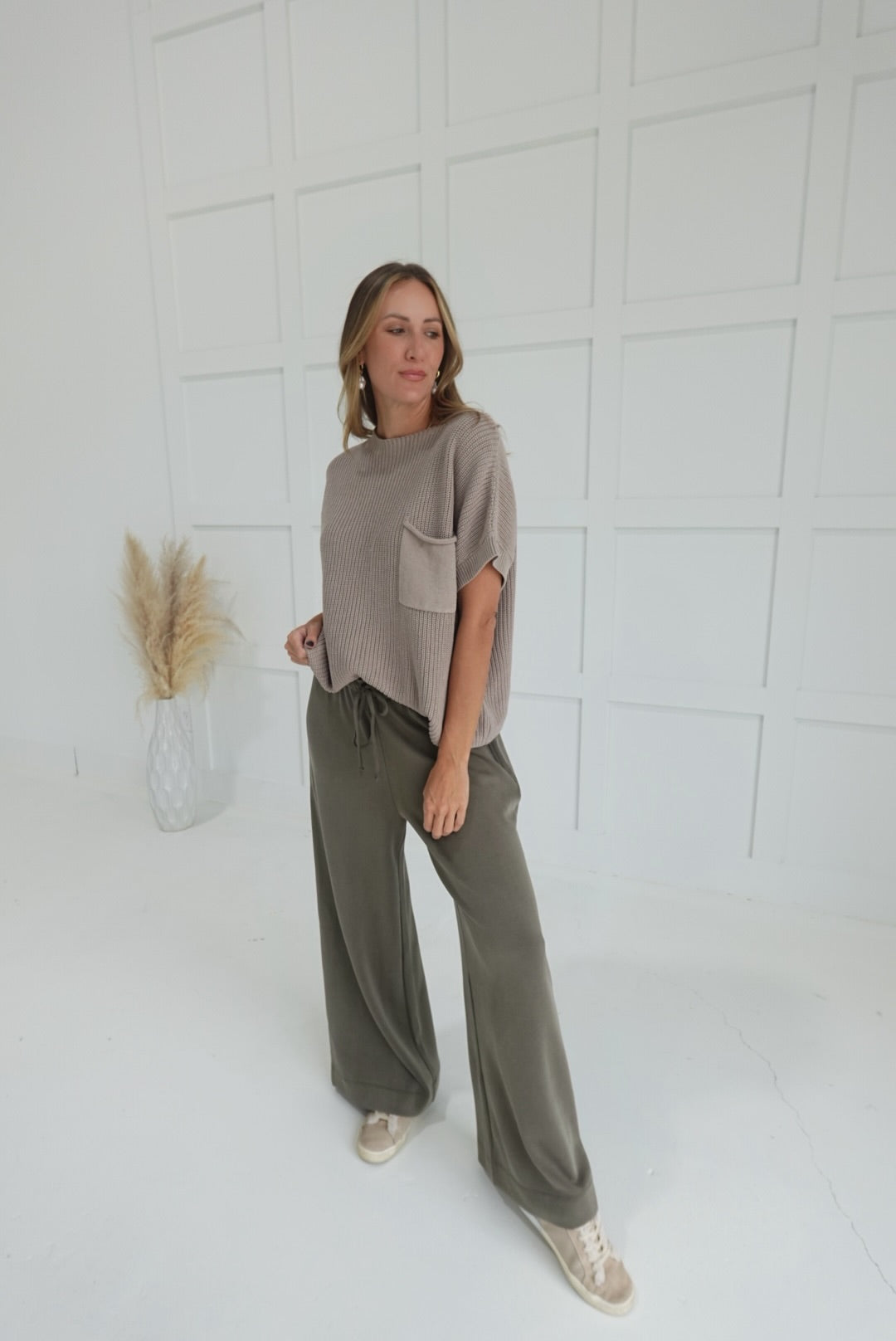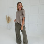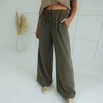 These Zina Wide Leg Pants feature a comfortable ruffle waistband that provides a flattering, adjustable fit. Designed with a relaxed wide-leg silhouette, they offer ease of movement and a stylish, laid-back look. The back pocket adds functional detail, perfect for essentials. Ideal for both casual and polished outfits, these pants combine comfort with effortless style.